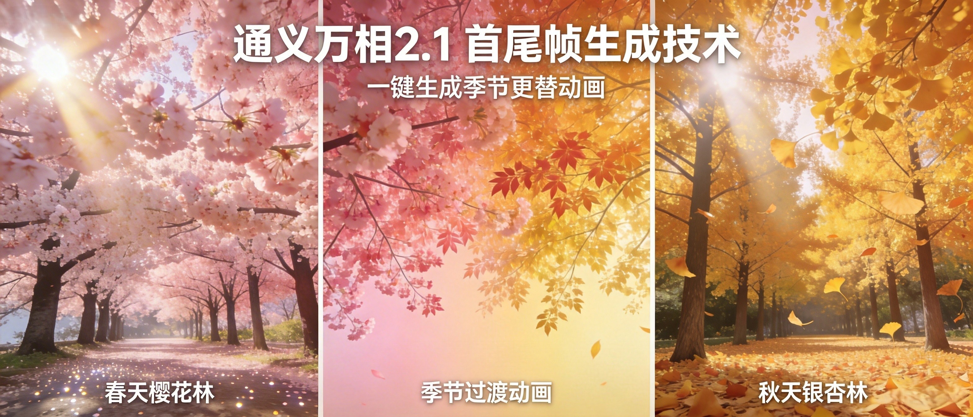 输入提示词:“从春天到秋天的自然过渡,阳光角度渐变,树叶颜色缓慢变化”。
